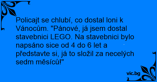 Policajt se chlubí, co dostal loni k Vánocům. "Pánové, já jsem dostal stavebnici LEGO. Na stavebnici bylo napsáno sice od 4 do 6 let a představte si, já to složil za necelých sedm měsíců!"