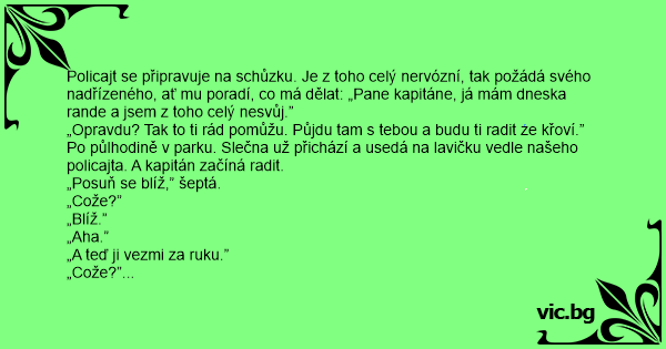 Policajt se připravuje na schůzku. Je z toho celý nervózní, tak požádá svého nadřízeného, ať mu poradí, co má dělat: „Pane kapitáne, já mám dneska rande a jsem z toho celý nesvůj.”