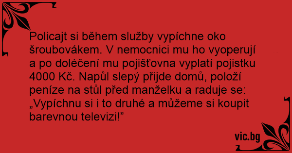 Policajt si během služby vypíchne oko šroubovákem. V nemocnici mu hо vyoperují a po doléčení mu pojišťovna vyplatí pojistku 4000 Kč. Napůl slepý přijde domů, položí peníze na stůl před manželku a raduje se: „Vypíchnu si i to druhé a můžeme si koupit barevnou televizi!”