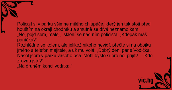 Rozhlédne se kolem, ale jelikož nikoho nevidí, přečte si na obojku jméno a telefon majitele, a už mu volá: „Dobrý den, pane Vodička. Našel jsem v parku vašeho psa. Mohl byste si pro něj přijít? ... Kde zrovna jste?”