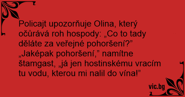 „Jaképak pohoršení,” namítne štamgast, „já jen hostinskému vracím tu vodu, kterou mi nalil do vína!”