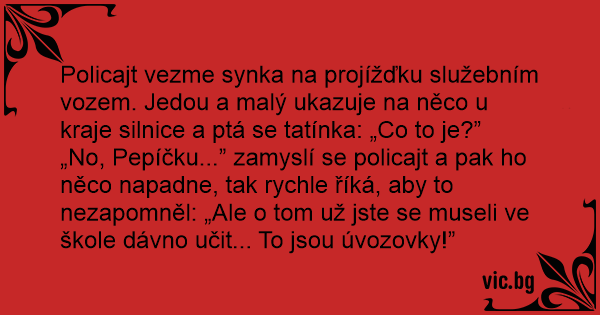 Policajt vezme synka na projížďku služebním vozem. Jedou a malý ukazuje na něco u kraje silnice a ptá se tatínka: „Co to je?”