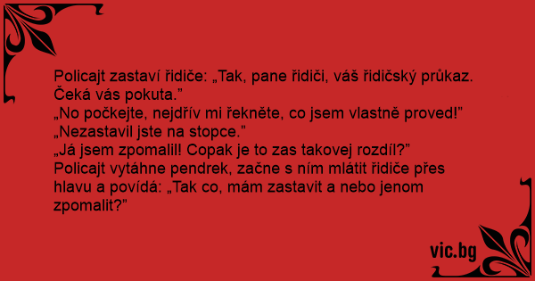 Policajt vytáhne pendrek, začne s ním mlátit řidiče přes hlavu a povídá: „Tak co, mám zastavit a nebo jenom zpomalit?”