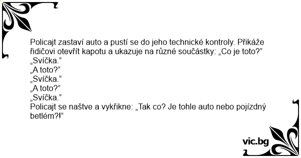 Policajt zastaví auto a pustí se do jeho technické kontroly. Přikáže řidičovi otevřít kapotu a ukazuje na různé součástky: „Co je toto?”