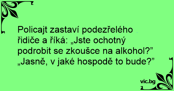Policajt zastaví podezřelého řidiče a říká: „Jste ochotný podrobit se zkoušce na alkohol?”