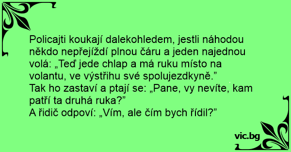 Policajti koukají dalekohledem, jestli náhodou někdo nepřejíždí plnou čáru a jeden najednou volá: „Teď jede chlap a má ruku místo na volantu, ve výstřihu své spolujezdkyně.”