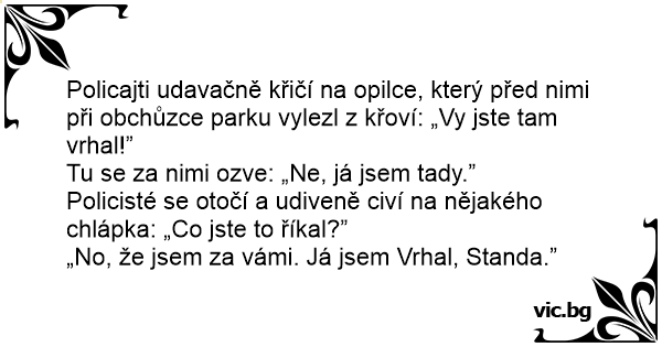 Policajti udavačně křičí na opilce, který před nimi při obchůzce parku vylezl z křoví: „Vy jste tam vrhal!”