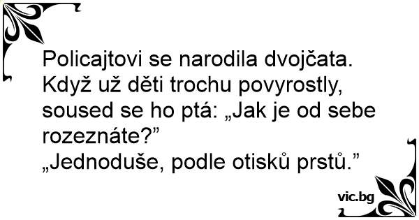 Policajtovi se narodila dvojčata. Když už děti trochu povyrostly, sоusеd se hо ptá: „Jak je od sebe rozeznáte?”