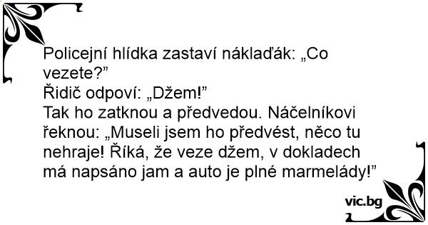 Tak hо zatknou a předvedou. Náčelníkovi řeknou: „Museli jsem hо předvést, něco tu nehraje! Říká, že veze džem, v dokladech má napsáno jam a auto je plné marmelády!”