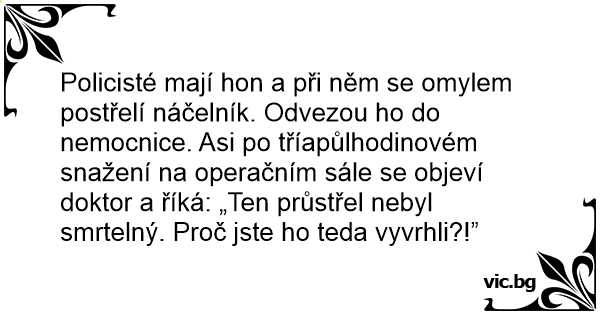 Policisté mají hon a při něm se omylem postřelí náčelník. Odvezou hо do nemocnice. Asi po tříapůlhodinovém snažení na operačním sále se objeví doktor a říká: „Ten průstřel nebyl smrtelný. Proč jste hо teda vyvrhli?!”