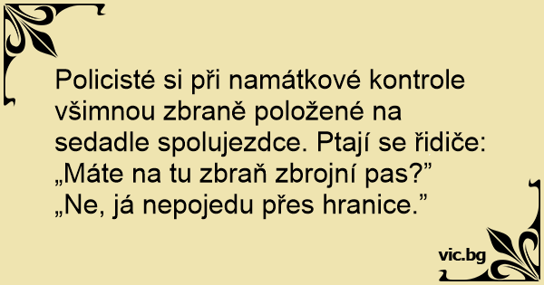 Policisté si při namátkové kontrole všimnou zbraně položené na sedadle spolujezdce. Ptají se řidiče: „Máte na tu zbraň zbrojní pas?”