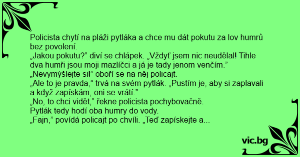 „Fajn,” povídá policajt po chvíli. „Teď zapískejte a schválně, jestli se ti humři vrátí!”