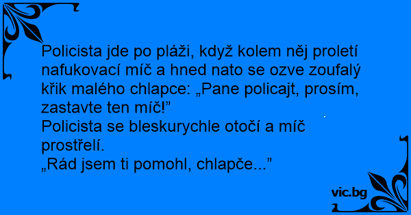 Policista jde po pláži, když kolem něj proletí nafukovací míč a hned nato se ozve zoufalý křik malého chlapce: „Pane policajt, prosím, zastavte ten míč!”