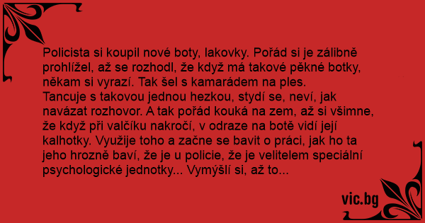 Policista si koupil nové boty, lakovky. Pořád si je zálibně prohlížel, až se rozhodl, že když má takové pěkné botky, někam si vyrazí. Tak šel s kamarádem na ples.