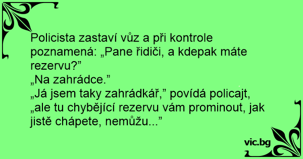 „Já jsem taky zahrádkář,” povídá policajt, „ale tu chybějící rezervu vám prominout, jak jistě chápete, nemůžu...”