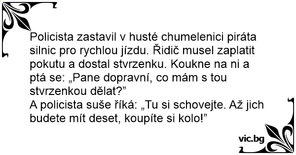 Policista zastavil v husté chumelenici piráta silnic pro rychlou jízdu. Řidič musel zaplatit pokutu a dostal stvrzenku. Koukne na ni a ptá se: „Pane dopravní, co mám s tou stvrzenkou dělat?”