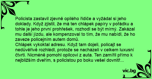 Chlápek vykoktal adresu. Když tam dojeli, policajt se nedůvěřivě rozhlédl, protože se nacházeli v celkem luxusní čtvrti. Nicméně pomohl opilcovi z auta. Ten zamířil přímo k nejbližším dveřím, s policistou po boku vešel dovnitř a povídá: „Hm, vidíte tamhle tu velkou televizi? Tak t-t-ta je moje! A ta kožená poh-hovka, ta je taky moje.”