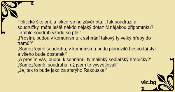 Politické školení, a lektor se na závěr ptá: „Tak soudruzi a soudružky, máte ještě někdo nějaký dotaz či nějakou připomínku? Tamhle soudruh vzadu se ptá.”