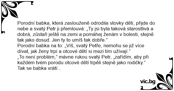 Porodní babka na to: „Víš, svatý Petře, nemohu se již více dívat, jak ženy trpí a otcové dětí si mezi tím užívají.”