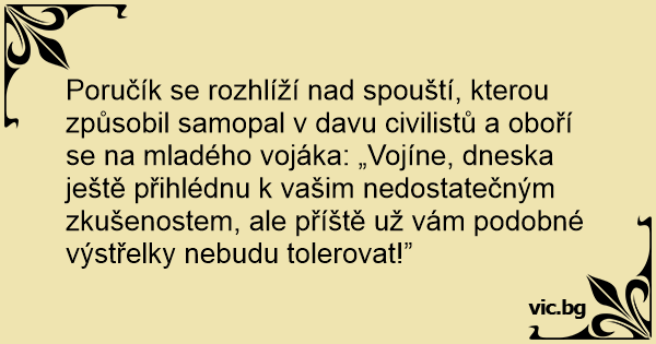 Poručík se rozhlíží nаd spouští, kterou způsobil samopal v davu civilistů a oboří se na mladého vojáka: „Vojíne, dneska ještě přihlédnu k vašim nedostatečným zkušenostem, ale příště už vám podobné výstřelky nebudu tolerovat!”