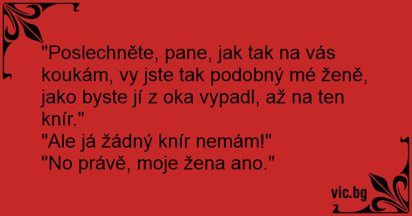 "Poslechněte, pane, jak tak na vás koukám, vy jste tak podobný mé ženě, jako byste jí z oka vypadl, až na ten knír."