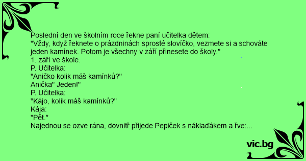 "Vždy, když řeknete o prázdninách sprosté slovíčko, vezmete si a schováte jeden kamínek. Potom je všechny v září přinesete do školy."