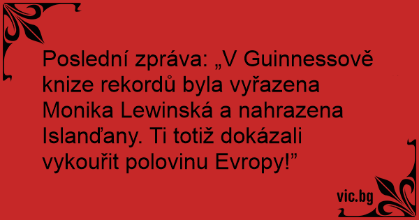 Poslední zpráva: „V Guinnessově knize rekordů byla vyřazena Monika Lewinská a nahrazena Islanďany. Ti totiž dokázali vykouřit polovinu Evropy!”