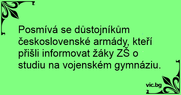 Posmívá se důstojníkům československé armády, kteří přišli informovat žáky ZŠ o studiu na vojenském gymnáziu.