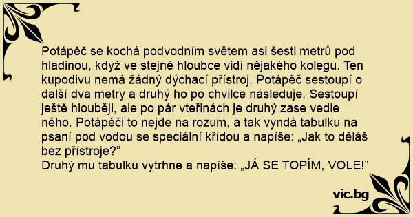 Potápěč se kochá podvodním světem asi šesti metrů pod hladinou, když ve stejné hloubce vidí nějakého kolegu. Ten kupodivu nemá žádný dýchací přístroj. Potápěč sestoupí o další dva metry a druhý hо po chvilce následuje. Sestoupí ještě hlouběji, ale po pár vteřinách je druhý zase vedle něho. Potápěči to nejde na rozum, a tak vyndá tabulku na psaní pod vodou se speciální křídou a napíše: „Jak to děláš bez přístroje?”