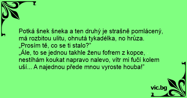 Potká šnek šneka a ten druhý je strašně pomlácený, má rozbitou ulitu, ohnutá tykadélka, no hrůza.