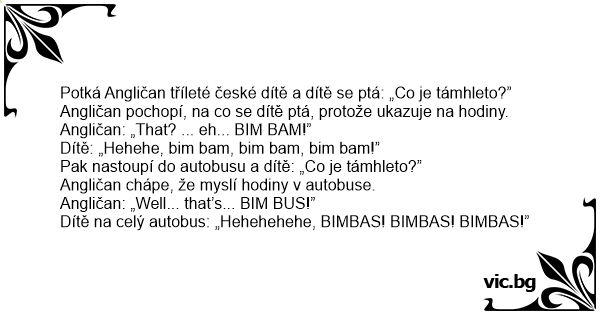 Potká Angličan tříleté české dítě a dítě se ptá: „Co je támhleto?”