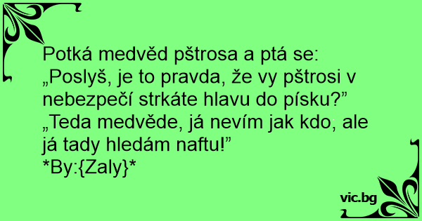 Potká medvěd pštrosa a ptá se: „Poslyš, je to pravda, že vy pštrosi v nebezpečí strkáte hlavu do písku?”