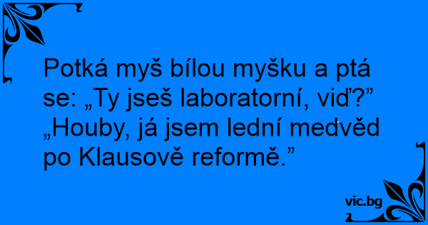 Potká myš bílou myšku a ptá se: „Ty jseš laboratorní, viď?”