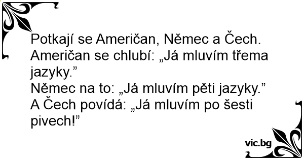 Potkají se Američan, Němec a Čech. Američan se chlubí: „Já mluvím třema jazyky.”
