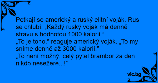 Potkají se americký a ruský elitní voják. Rus se chlubí: „Každý ruský voják má denně stravu s hodnotou 1000 kalorií.”