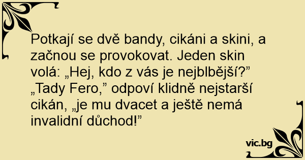 Potkají se dvě bandy, cikáni a skini, a začnou se provokovat. Jeden skin volá: „Hej, kdo z vás je nejblbější?”