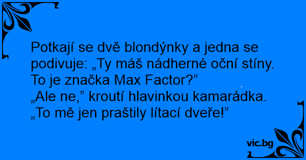 Potkají se dvě blondýnky a jedna se podivuje: „Ty máš nádherné oční stíny. To je značka Max Factor?”