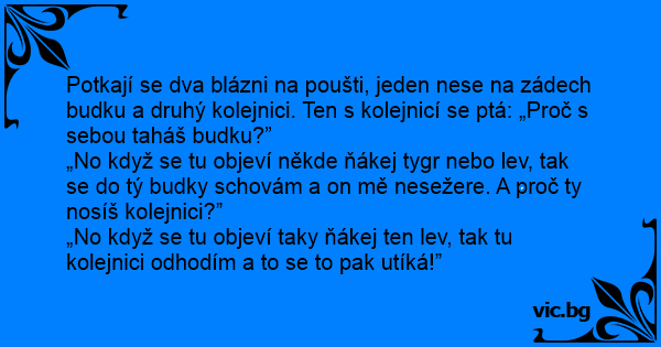 Potkají se dva blázni na poušti, jeden nese na zádech budku a druhý kolejnici. Ten s kolejnicí se ptá: „Proč s sebou taháš budku?”