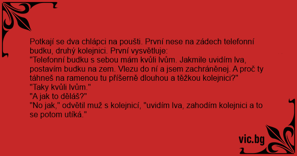 Potkají se dva chlápci na poušti. První nese na zádech telefonní budku, druhý kolejnici. První vysvětluje:
