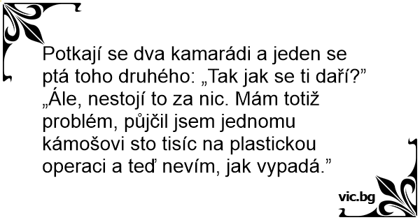 „Ále, nestojí to za nic. Mám totiž problém, půjčil jsem jednomu kámošovi sto tisíc na plastickou operaci a teď nevím, jak vypadá.”