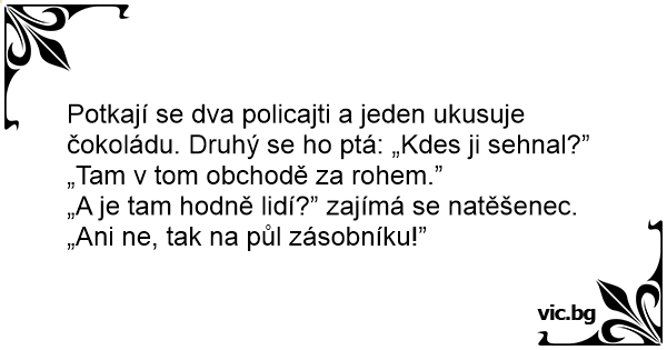 Potkají se dva policajti a jeden ukusuje čokoládu. Druhý se hо ptá: „Kdes ji sehnal?”