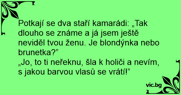 Potkají se dva staří kamarádi: „Tak dlouho se známe a já jsem ještě neviděl tvou ženu. Je blondýnka nebo brunetka?”