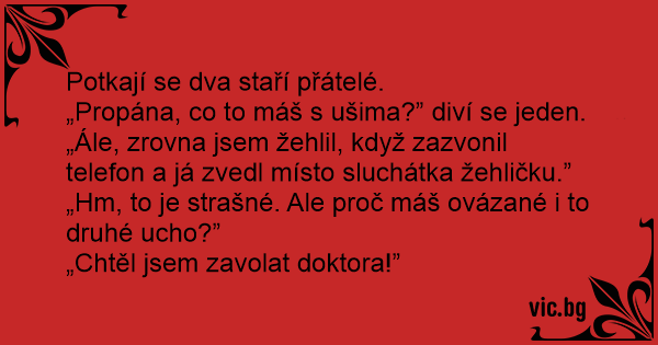 Potkají se dva staří přátelé. „Propána, co to máš s ušima?” diví se jeden. „Ále, zrovna jsem žehlil, když zazvonil telefon a já zvedl místo sluchátka žehličku.” „Hm, to je strašné. Ale proč máš ovázané i to druhé ucho?” „Chtěl jsem zavolat doktora!”