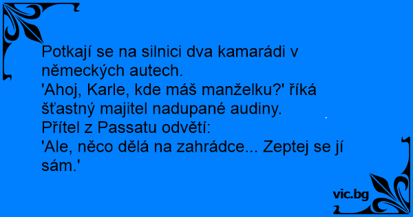 'Ahoj, Karle, kde máš manželku?' říká šťastný majitel nadupané audiny.