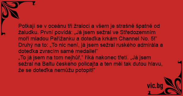 Potkají se v oceánu tři žraloci a všem je strašně špatně od žaludku. První povídá: „Já jsem sežral ve Středozemním moři mladou Pařížanku a doteďka krkám Channel No. 5!”