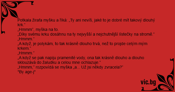 Potkala žirafa myšku a říká: „Ty ani nevíš, jaké to je dobré mít takový dlouhý krk.”