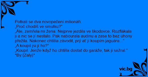 „Ále, zemřela mi žena. Nejprve jezdila ve škodovce. Rozflákala ji a nic se jí nestalo. Pak nabourala audinu a zase to bez úhony přežila. Nakonec chtěla závodit, prý ať jí koupím jaguára...”