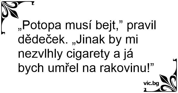 „Potopa musí bejt,” pravil dědeček. „Jinak by mi nezvlhly cigarety a já bych umřel na rakovinu!”