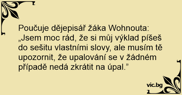Poučuje dějepisář žáka Wohnouta: „Jsem moc rád, že si můj výklad píšeš do sešitu vlastními slovy, ale musím tě upozornit, že upalování se v žádném případě nedá zkrátit na úpal.”