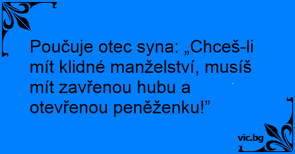 Poučuje otec syna: „Chceš-li mít klidné manželství, musíš mít zavřenou hubu a otevřenou peněženku!”